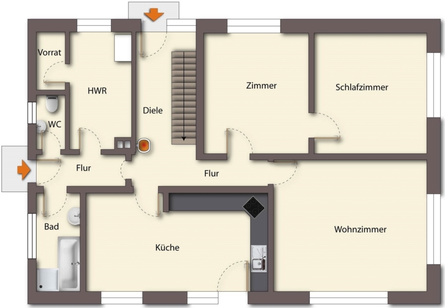 Flur/Dielenbereich, Gäste-WC, Bad, HWR (+ kl. Abstellraum), Wohnküche, 3 Zimmer
