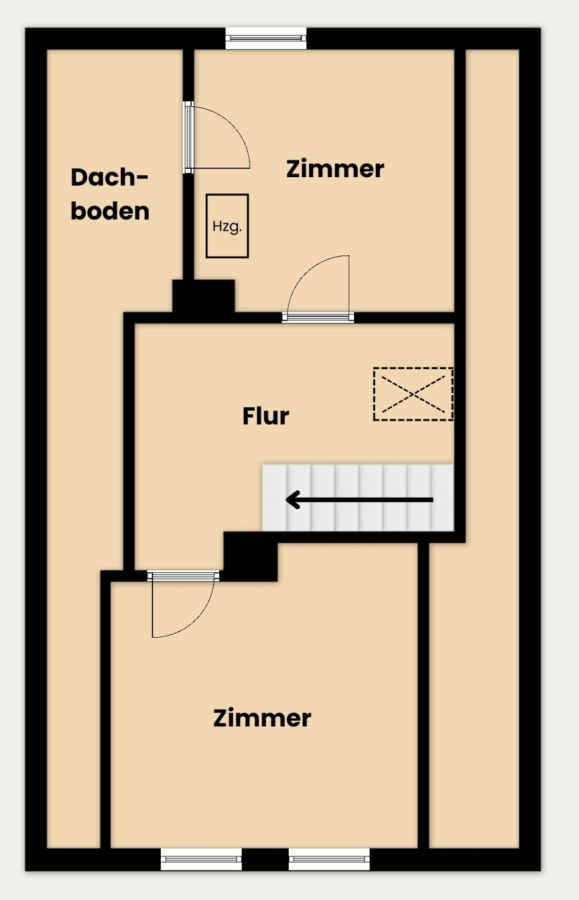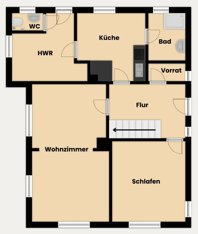 Diele, Abstellraum, Schlafzimmer, Doppel-Wohnzimmer, Küche, Bad, HWR, WC