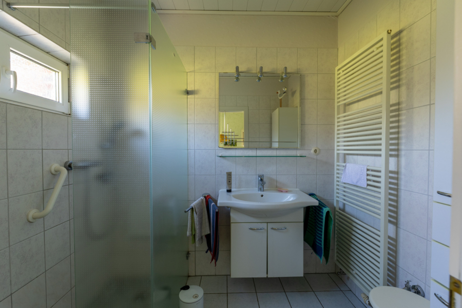 Bad mit barrierefreier Dusche und Waschbecken aus ca. 1999