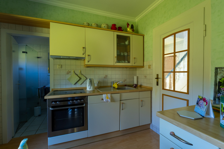 Das Badezimmer ist mit einer barrierefreien Dusche ausgestattet, der praktische Hauswirtschaftsraum mit Zugang zum Garten unterstützt sinnvoll tägliche Abläufe, ein Kellerraum bietet zusätzlichen Stauraum.