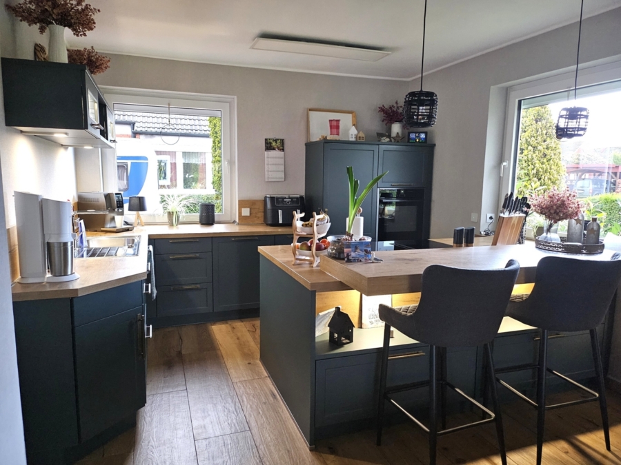 Das Erdgeschoss überzeugt durch einen offenen Wohn/Ess/Küchenbereich – durch viel Lichteinfall bietet sich hier eine freundliche, einladende Atmosphäre. Eine moderne Einbauküche aus dem Jahr 2024 ergänzt das Raumkonzept und ermöglicht das unmittelbare Kocherlebnis im Mittelpunkt des täglichen Lebens.