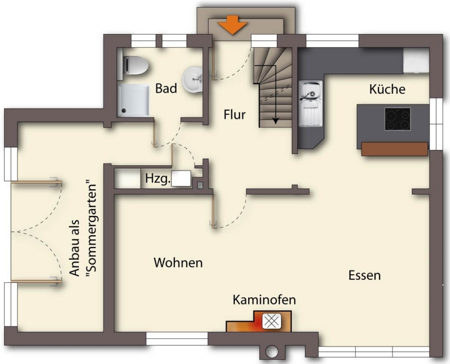 Flur, offener Wohn/Ess/Kochbereich, Bad, Anbau als einfacher Sommergarten